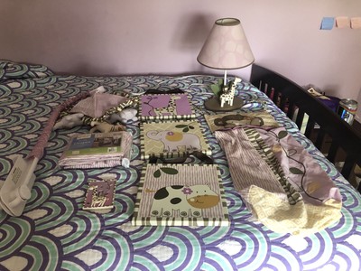 One comforter, one bumper, one fitted sheet, one skirt, two window valances, one diaper stacker, one.